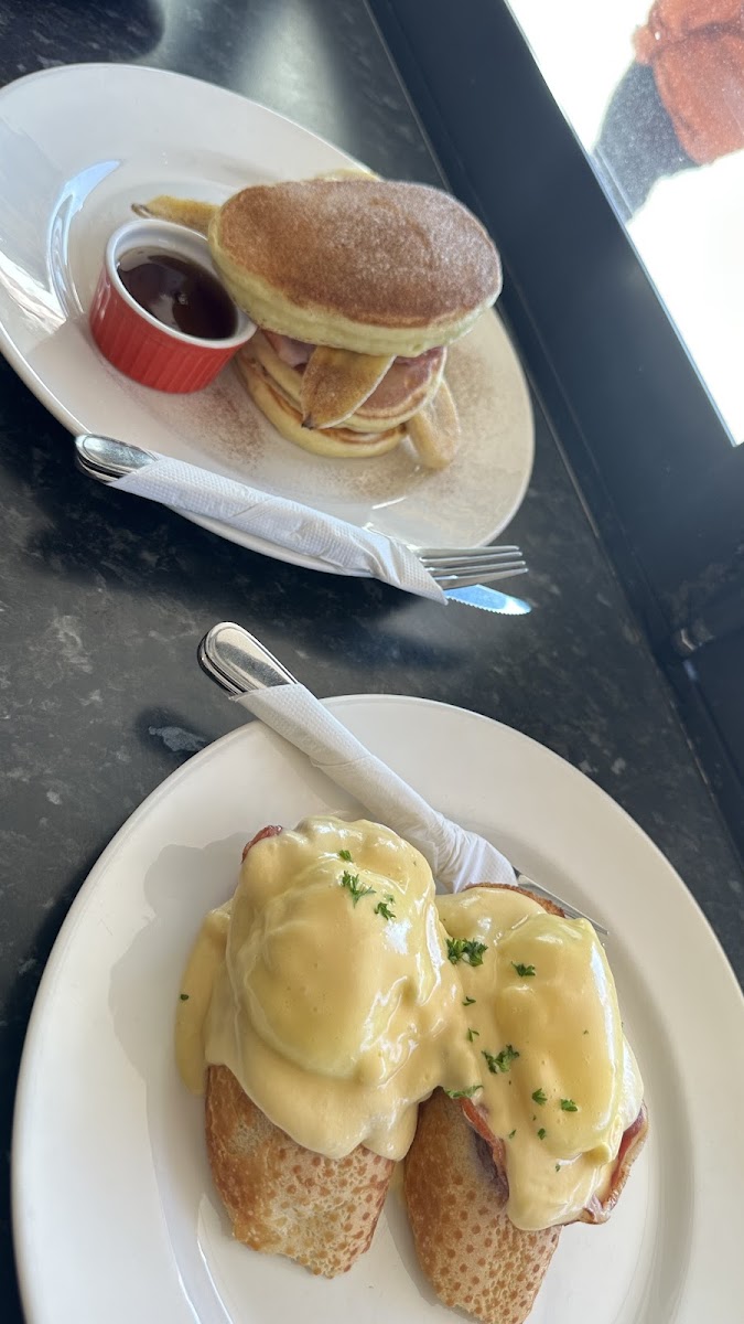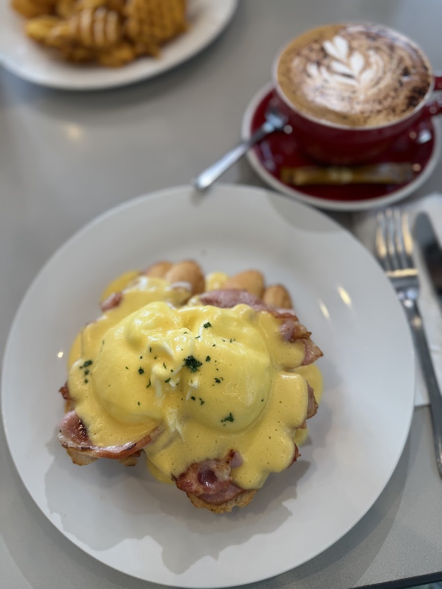 The menu reads like a dependable lineup of breakfast staples, with highlights including a generous Big Breakfast Plate, bacon Eggs Benedict rich with sauce, and simple but satisfying items like pies, quiches, and sandwiches on Vogel bread. Portions feel hearty without being overwhelming, making it a practical stop for families, solo commuters, or friends catching up over a casual meal. Kids are well catered for too, with options like banana pancakes paired with bacon or chicken nuggets and chips.